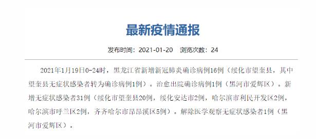 2021年1月19日0-24时,黑龙江省新增新冠肺炎确诊病例16例(绥化市望奎县,其中望奎县无症状感染者转为确诊病例1例)。治愈出院确诊病例1例(黑河市爱辉区)。新增无症状感染者31例(绥化市望奎县20例,绥化安达市2例,哈尔滨市利民开发区2例,哈尔滨市呼兰区2例,齐齐哈尔市昂昂溪区5例)。解除医学观察无症状感染者1例(黑河市爱辉区)。