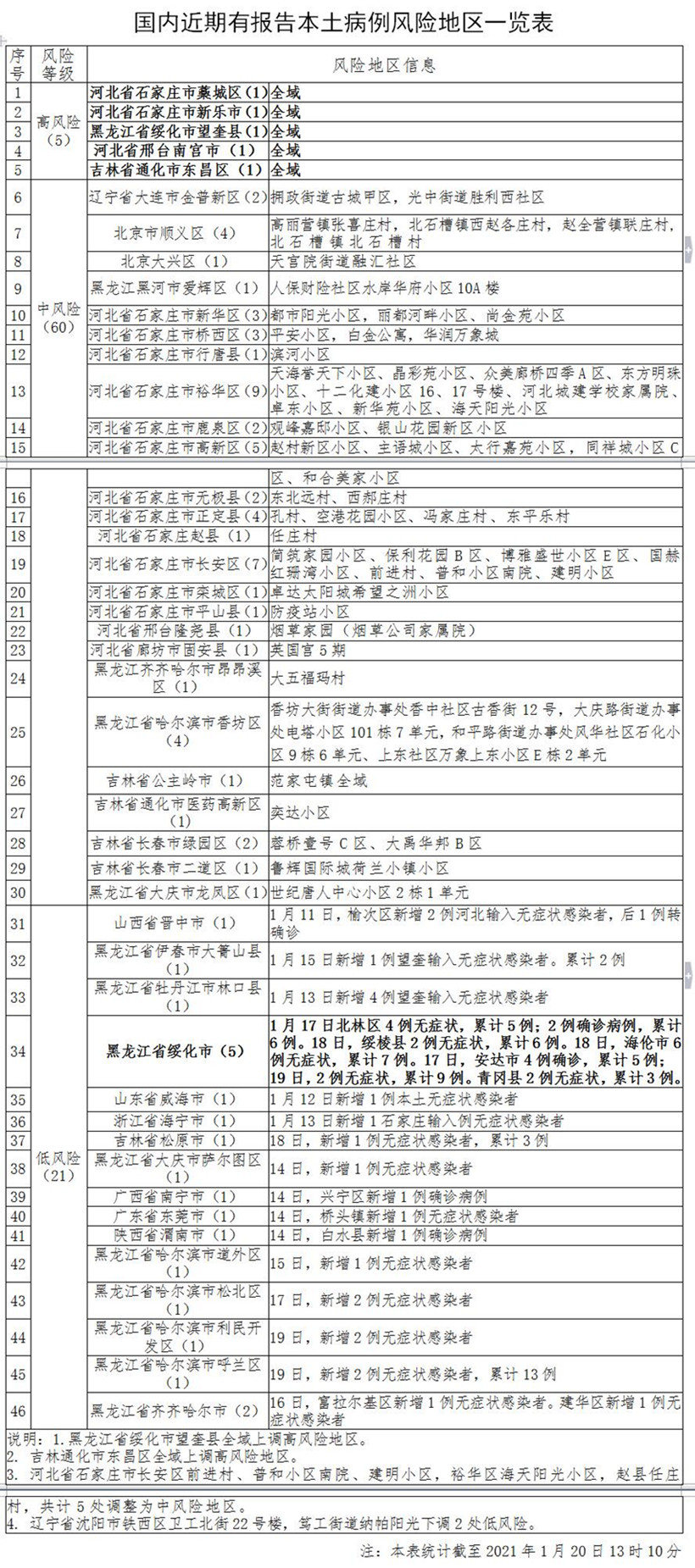 截至2021年1月20日13时10分,全国共有新冠肺炎疫情高风险地区5个,中风险地区60个。