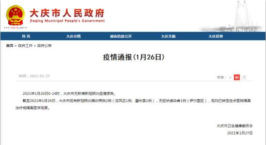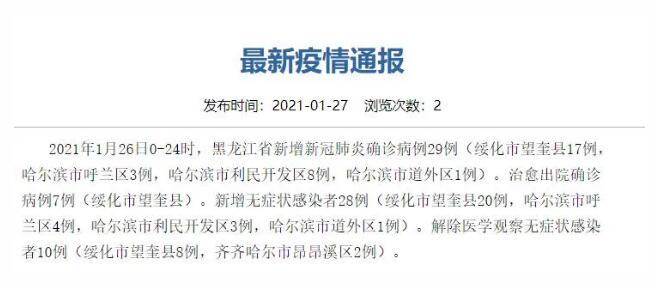 1月26日黑龙江省新增确诊病例29例,大庆市无新增疫情报告