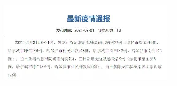 2021年1月31日0-24时,黑龙江省新增新冠肺炎确诊病例22例(绥化市望奎县9例,哈尔滨市呼兰区6例,哈尔滨市利民开发区3例,哈尔滨市道里区2例,哈尔滨市南岗区2例);当日新增治愈出院确诊病例7例。当日新增无症状感染者9例(绥化市望奎县6例,哈尔滨市呼兰区2例,哈尔滨市利民开发区1例);当日解除无症状感染者医学观察17例。