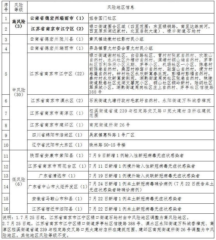 截至7月24日24时,江苏南京市共发现57例阳性,分别分布为江宁区51例、溧水区4例、建邺区1例、高淳区1例。 根据江苏南京市卫生健康委员会通报,7月25日起,江苏省南京市江宁区禄口街道石埝村由中风险地区调整为高风险地区。江苏省南京市江宁区禄口街道茅亭社区信陵路388号、溧水区永阳街道万科城香樟苑、高淳区桠溪街道省道239与桠定路交叉路口芜太建材店所在建筑范围、建邺区南苑街道所街26号调整为中风险地区。其他地区风险等级不变。具体情况详见下表: 今日第2次调整国内近期有报告本土病例风险地区一览表 注:本表统计截至2021年7月25日12时00分 为精准做好我市新冠肺炎疫情“外防输入、内防反弹”常态化防控工作,克服麻痹思想、厌战情绪,有效控制和降低新冠肺炎疫情传播风险,现对广大市民朋友提出如下疫情防控建议: 一、自7月6日以来从江苏省南京市、经停及到过南京禄口国际机场抵(返)庆人员需主动向所在单位、社区(村屯)报备,主动报告机场内活动轨迹及接触史,并配合落实相关管控措施。 二、请市民非必要不要前往中高风险地区,若前往,要提前向所在单位、社区(村屯)报备,同时做好个人防护。 三、如与全国发布的病例轨迹信息有交集,要主动向居住地所在社区及辖区疾控中心报备,主动报告14天内活动轨迹及接触史,并配合落实相关管控措施。 四、加强个人防护。在人员密集和封闭场所,坚持科学规范佩戴口罩,养成勤洗手、常通风、“一米线”、公勺公筷、咳嗽礼仪等良好卫生习惯和健康生活方式。如出现发热、干咳、乏力、咽痛、嗅(味)觉减退、腹泻等新冠肺炎疑似症状,请立即联系社区(村屯),并做好个人防护与隔离,等待安排专车转运至定点医院发热门诊就医,配合落实相关管控措施。 五、及时接种新冠疫苗,是有效预防和控制新冠肺炎疫情的重要手段。请广大市民积极配合相关部门有序到辖区疫苗接种点接种新冠疫苗。 六、为有效防范境外疫情输入,请入境、江苏南京及中高风险地区抵(返)庆人员入庆前必须要扫描返庆人员登记二维码进行申报,并由属地根据申报内容进行精准管控。二维码见下图: 七、处理个人邮寄的境外物品或国内疫情中高风险地区及有本土病例发生地区的快递包裹时,要做好个人防护,尽量在室外拆包,落实好手卫生和物品消毒处理。同时正确处理冷鲜食品。 八、请广大市民主动报备并积极配合流调工作,这是每一位公民应尽的义务和应履行的法律责任。若因不报备、不执行有关防控措施,影响疫情防控工作,将依法追究责任。 大庆市疾病预防控制中心 2021年7月25日 大庆市各县区疫情防控指挥部联系电话 让胡路区 0459-6352331 区值班室0459-5596291 萨尔图区 0459-6181900 高新区 0459-6040009 0459-6288901 红岗区 0459-6780888 大同区 0459-6161530 龙凤区 0459-6059157 0459-2767159 肇州县 0459-8520361 肇源县 0459-8241033 林甸县 0459-3317221(白) 0459-3323298(夜) 社区0459-3314119 乡镇0459-3322541 杜蒙县 社区0459-3422588 乡镇0459-3452053 大庆市各县区疾控中心联系电话 萨区疾控:0459-6279221 让区疾控:0459-6352591 龙凤疾控:0459-2767159 红岗疾控:0459-2799135 大同疾控:0459-6173877 肇州疾控:0459-8520511 肇源疾控:0459-8232328 林甸疾控:0459-3322473 杜蒙疾控:0459-3410143 |