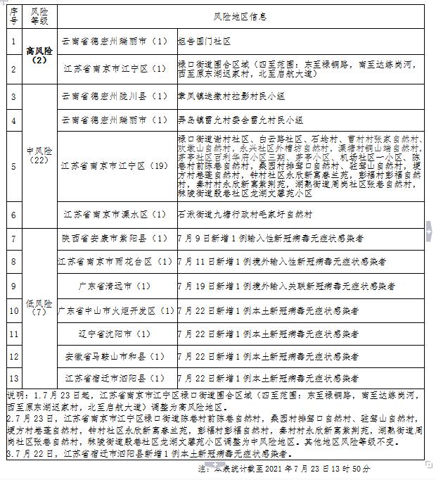 自2021年7月23日起,江苏南京市部分区域疫情风险等级进行调整:江宁区禄口街道围合区域(四至范围:东至禄铜路,南至达练岗河,西至原东湖迟家村,北至启航大道)调整为高风险地区;江宁区禄口街道陈巷村前陈巷自然村,桑园村排驾口自然村、驻驾山自然村,埂方村卷蓬自然村,钟村社区永欣新寓春兰苑,彭福村彭福自然村,秦村村永欣新寓紫荆苑,湖熟街道周岗社区张巷自然村,秣陵街道殷巷社区龙湖文馨苑小区调整为中风险地区。其他地区风险等级不变。