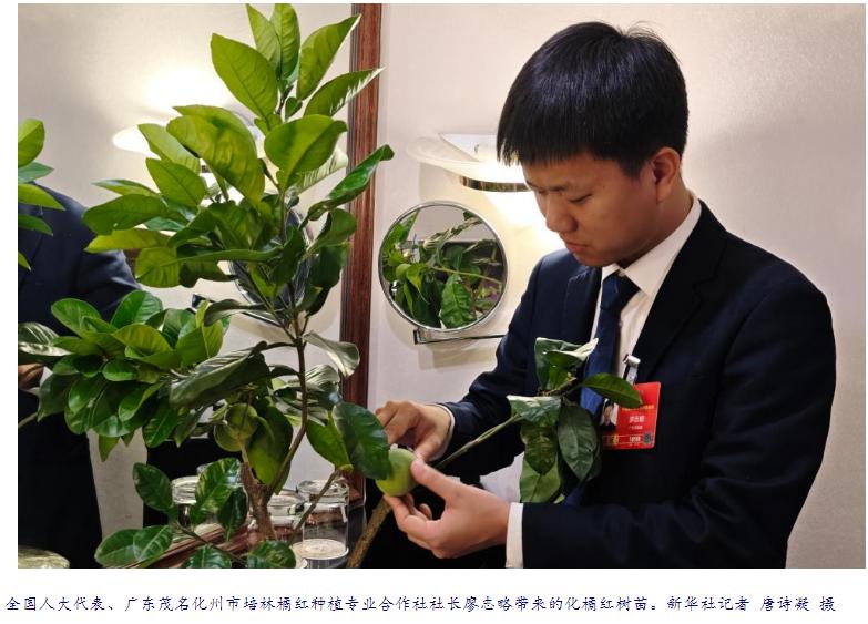 十四届全国人大四次会议开幕前夕,记者在广东代表团驻地见到全国人大代表、广东茂名化州市培林橘红种植专业合作社社长廖志略时,他正忙着“开箱”今年带到北京参会的手信——一株挂了果的化橘红树苗,还有一兜深加工的化橘红产品和一张集纳了乡亲们笑脸的3D照片。