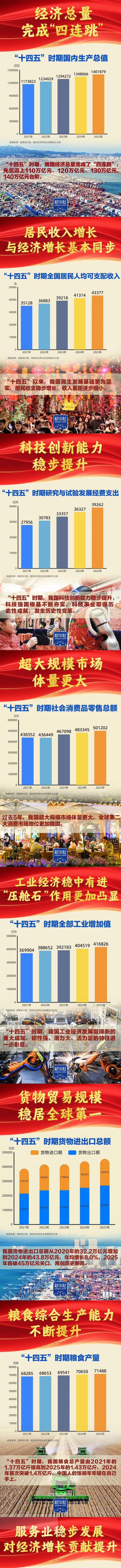 “十四五”胜利收官,“十五五”崭新开局。我国经济总量完成“四连跳”,跃上140万亿元大关,经济实力、科技实力、综合国力跃上新台阶,中国式现代化迈出新的坚实步伐,第二个百年奋斗目标新征程实现良好开局。2026年全国两会召开,举世瞩目。我们梳理出九组数据,一起感受胜利收官的壮阔历程、启新开局的高光时刻。
