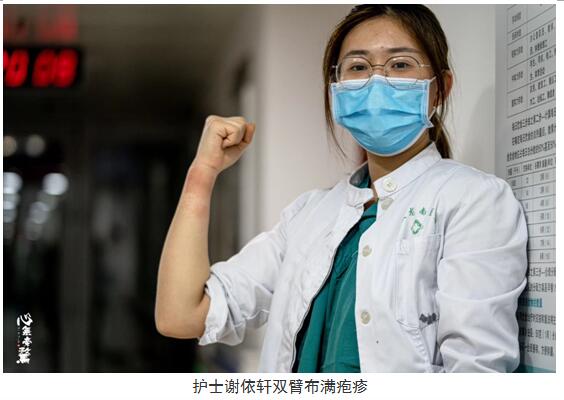 连续长时间戴着防护口罩,每个人的脸颊、鼻梁都被勒出了压疮,手上、胳膊上不光在胶皮手套里捂得肿胀、发白,还布满裂痕和水泡,因为戴口罩时间过久,耳朵后面出现脓疱。