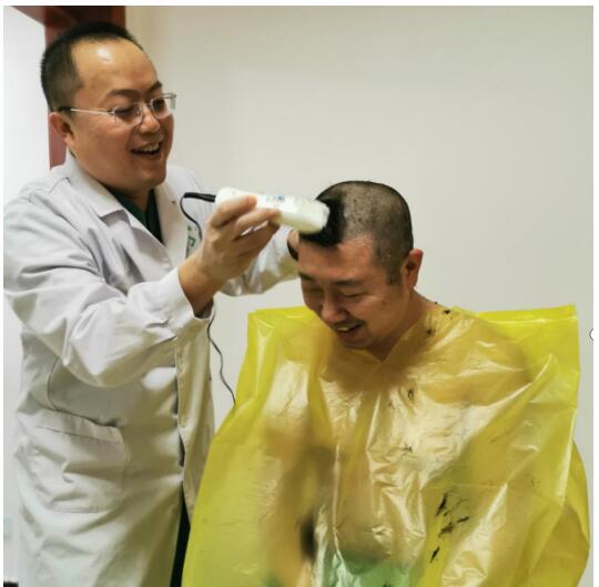 乳腺外科主任宋文卿为将进入隔离区医生剃头
