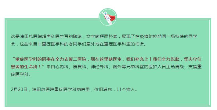 我是油田总医院超声科医生刘春鹤,疫情来临,总医院医护人员每一天都依旧像往常一样上班、出诊看病人。值班那天上午,去医院重症医学科(ICU)做床旁彩超,却意外地来了一场“同学会”。
