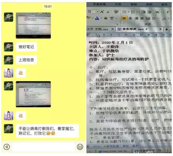 在疫情形势严峻的情况下,理疗科护士长王俊萍带领着团队依旧不忘学习。她说:“有条件要上,没有条件创造条件也要上。虽然疫情让我们不能坐在一起学习,但我们可以在手机微信群里学起来。不能让病毒打倒我们,要掌握它、熟记它、打败它!”