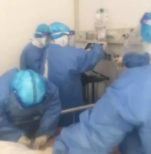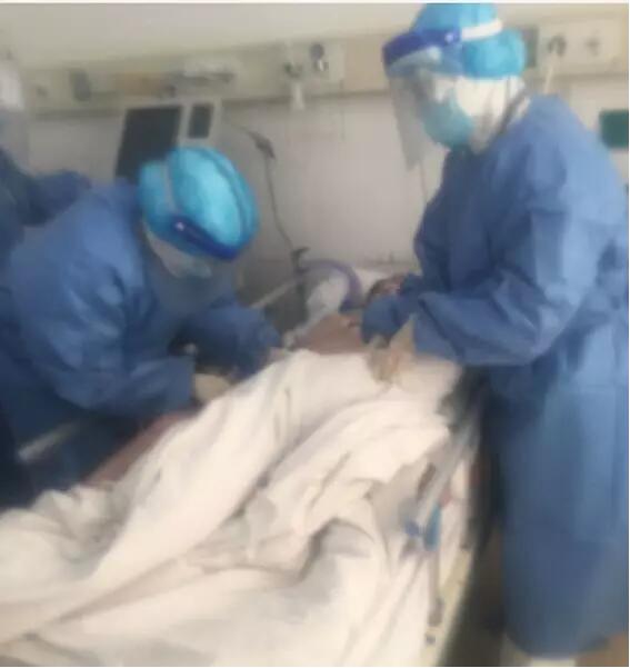 与死神赛跑,分秒必争。接到抢救通知,重症医学科(ICU)责任主治医陈波、老年病科责任主治医邓庆梅,迅速穿戴好防护服、防渗透隔离衣,进入隔离病区。