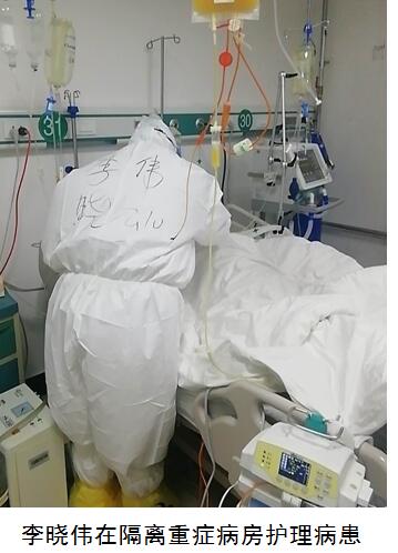 出行前她郑重的向党组织递交了入党申请书,要时刻以一名党员的要求鞭策自己。为了尽快进入工作状态,她向首批同事请教,通过网上查询学习所需各类仪器的使用方法和特殊操作,反复在脑海中演练,熟记于心。进入隔离重症病房,众多仪器工作灯不停闪烁、输液架上挂满了输液瓶……此刻才清楚什么是战疫前沿。 同行而来的几个护理姐妹,只有她最年长,她主动担起责任,每次值班她都会先分配任务,李晓伟总是把最重的患者留给自己护理。明知气管插管应用呼吸机给病人吸痰存在高风险,为了确保病人有效通气,她一次又一次的完成“探雷”行动。由于病人管路多,翻身很困难,需要大家配合密切,翻身、叩背、清理二便、妥善固定管路,一系列的操作在密闭的防护服下进行。多层口罩下是她干裂的口唇,由于长时间戴无菌手套,双手出现严重湿疹,并伴有流脓,每次洗手时,手背都会刺痛无比,可她并没有诉苦诉累,悄悄涂抹药膏后继续坚持在一线。 每次进入监护室前,她都会检查同事们防护是否到位,工作中更是关注她们的防护和身体情况。一次值班时,她发现同组护士外科口罩出现移位,同时另外一名护士出现低血糖反应,她立即让同伴们撤出隔离区,叮嘱她们做好处理,并委托他人在缓冲区进行接应,自己接替她俩分管病人的护理工作......她就是这样一个果敢、坚毅的护理人,在疫情前沿践行着责任与担当。