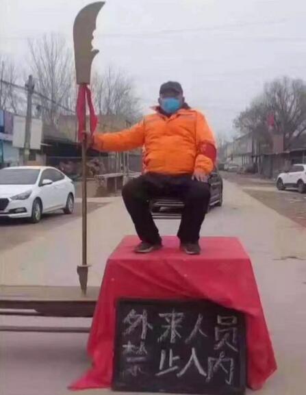 为防控疫情,不少村庄、地区都采取了封闭道路的措施,路障、警戒线,甚至“关公”都派上了用场。