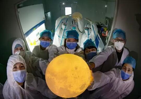 “元宵节快乐!中国加油!大庆加油!”实验室外的7人手触月亮灯,实验室内的3人共同挥手,隔窗团聚画面在这一刻定格……