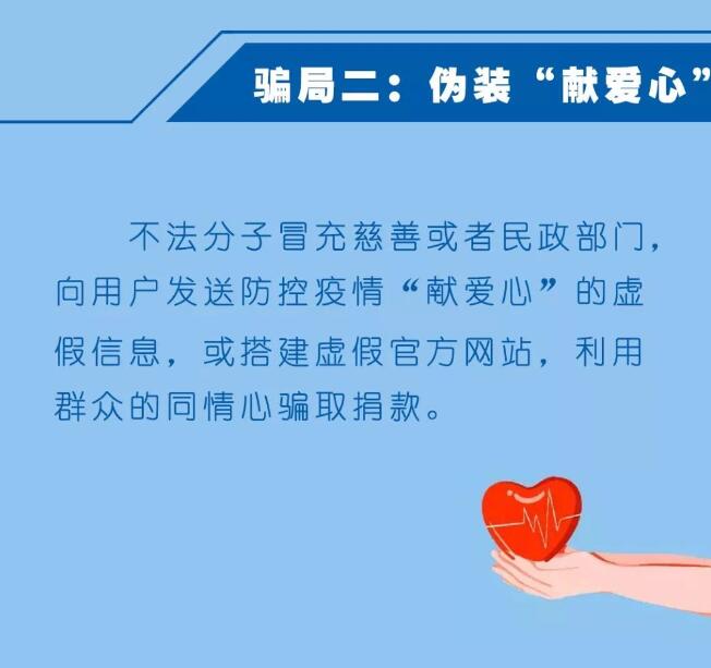 骗局二:不法分子冒充慈善或民政部门,向用户发送防控疫情“献爱心”的虚假信息,或搭建虚假官方网站,利用群众的同情心骗取捐款。
