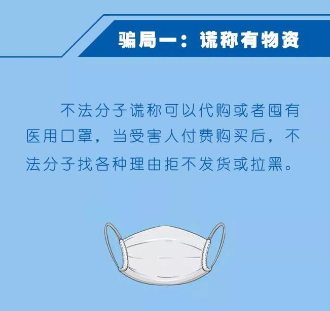 骗局一:不法分子谎称可以代购或者囤有医用口罩,当受害人付费购买后,不法分子找各种理由拒不发货或拉黑。