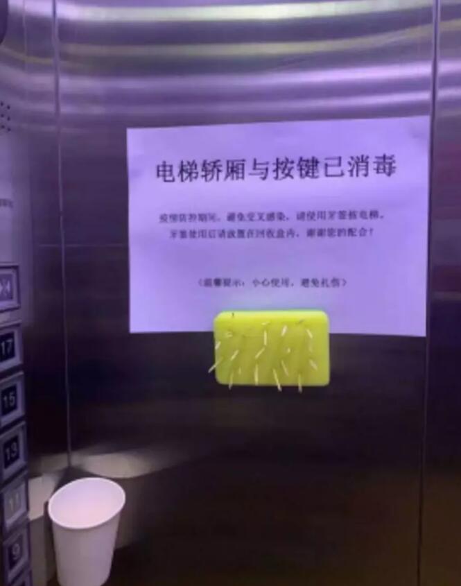 三服务萨尔图区书香名邸小区的铭达物业,在电梯按键旁边配备了牙签和小纸杯。牙签稀稀疏疏地插在海绵上,业主取用时完全不会碰到其他的牙签。用牙签按电梯,用后扔到小纸杯里由物业统一回收,避免了与电梯按键直接接触,简单、干净、经济又环保。