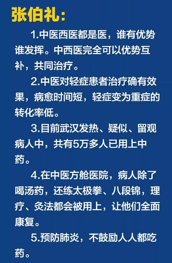 “我们还是强调中医西医都是医,谁有优势谁发挥。”张伯礼直言,中医和西医都各有优点,可以优势互补,共同治疗,“根据各自症状,优势,更好地科学调配床位资源,保证各类病人都能得到应有的救治”。
