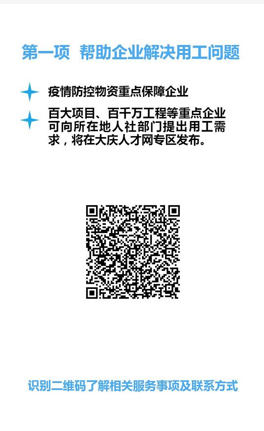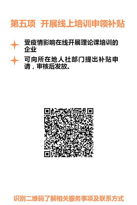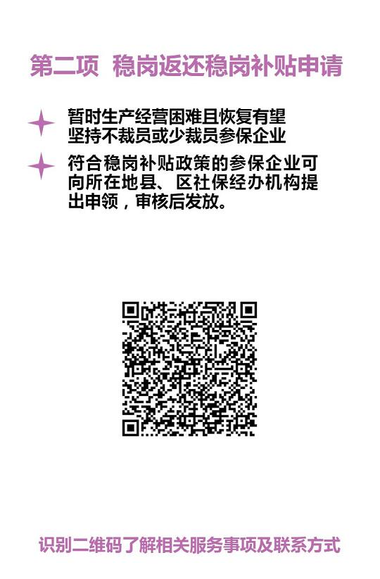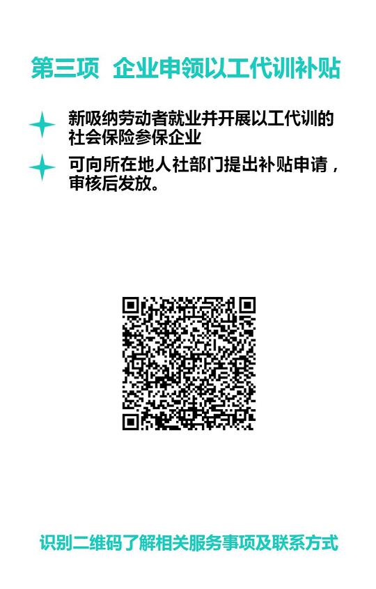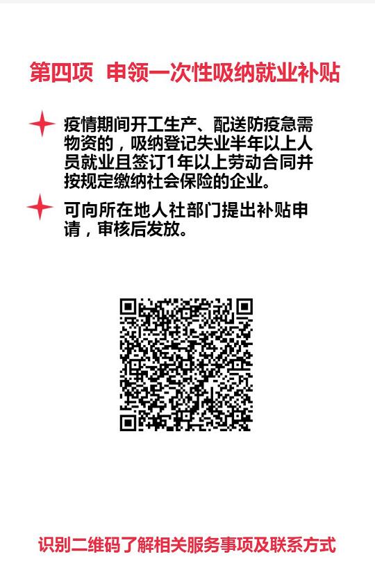 为了让企业能够精准了解人社部门保障企业复工复产七项优惠政策,高效办理相关业务,及时享受到政府政策福利,市人社局制作了各项扶持政策和服务举措的“一图公示卡”,扫描图中二维码即可全面了解相应办理条件、线上办事窗口联系方式和政策解读渠道,希望大家尽快享受到应有政策待遇!