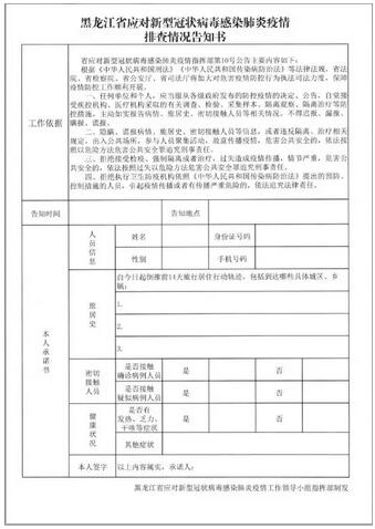 黑龙江省要求使用统一的疫情排查情况告知书!