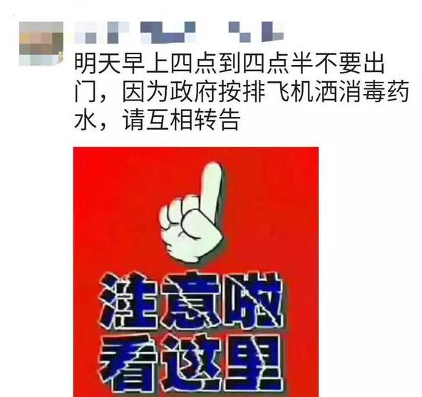 明天早四点到四点半不要出门,因为政府安排飞机洒药消毒,请互相转告。