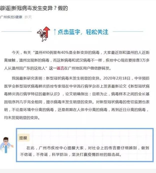 广州市疾病预防控制中心介绍,18日,有关“温州490例里有40%是全新变异的病毒,大家最近别和温州的人近距离接触,温州出现新的病毒,而这新病毒和武汉病毒不一样,疾控中心现在要排查3万多人从温州回广东的这批人”这一谣言在广州地区用户微信群转发。