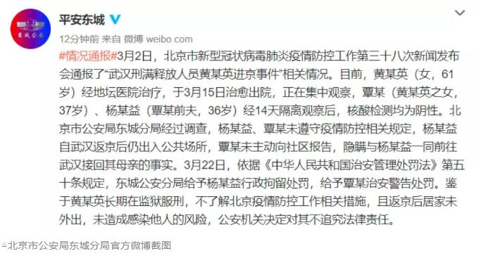 3月22日,依据《中华人民共和国治安管理处罚法》第五十条规定,东城公安分局给予杨某益行政拘留处罚,给予覃某治安警告处罚。鉴于黄某英长期在监狱服刑,不了解北京疫情防控工作相关措施,且返京后居家未外出,未造成感染他人的风险,公安机关决定对其不追究法律责任。