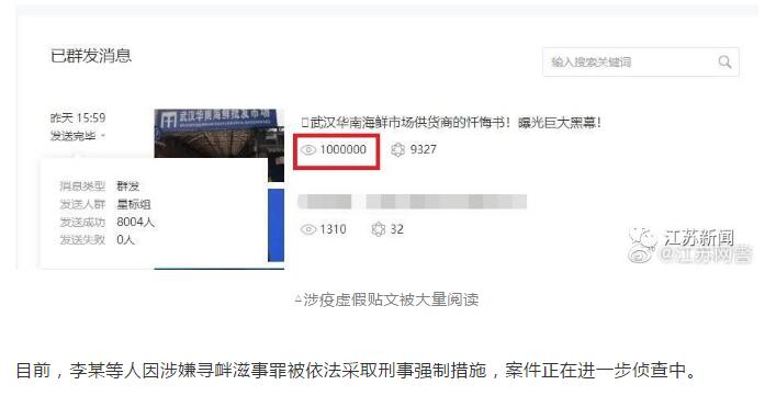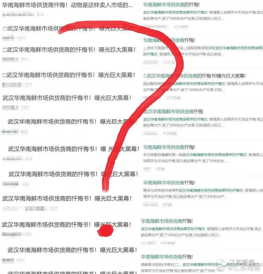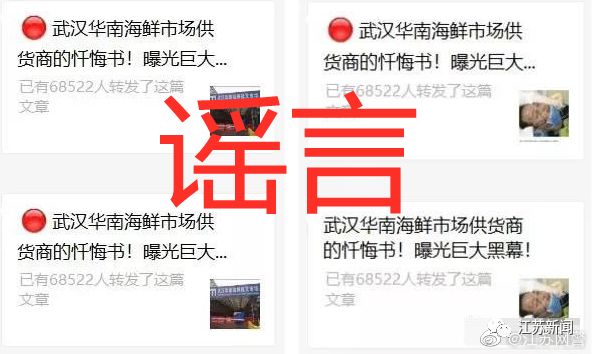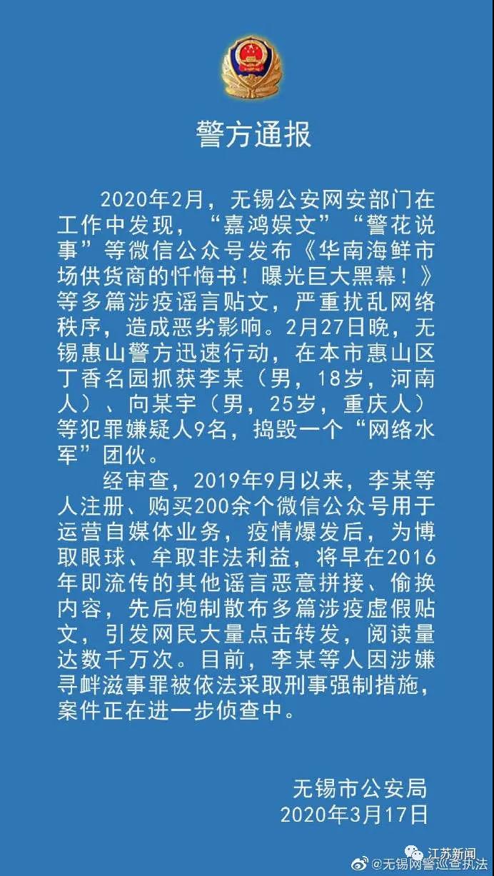据微博@无锡网警巡查执法、@江苏网警消息,2020年2月,江苏无锡公安网安部门在工作中发现,“嘉鸿娱文”“警花说事”等微信公众号发布《华南海鲜市场供货商的忏悔书!曝光巨大黑幕!》等多篇涉疫谣言贴文,严重扰乱网络秩序,造成恶劣影响。