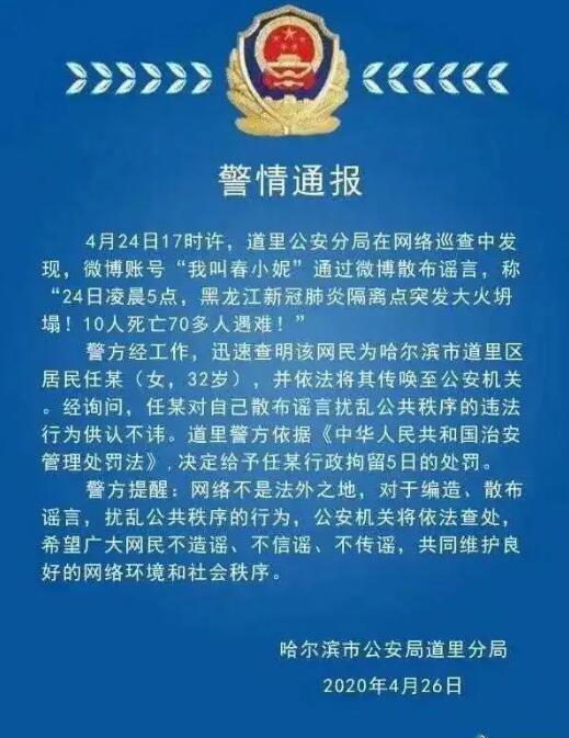 据黑龙江省哈尔滨市公安局道里分局官方微博,4月24日17时许,微博账号“我叫小春妮”通过微博散布谣言称“24日凌晨5点,黑龙江新冠肺炎隔离点突发大火坍塌!10人死亡70多人遇难!”警方经过工作,将任某依法传唤至公安机关,任某对自己散布谣言供认不讳。警方决定依法给予任某行政拘留5日的处罚。