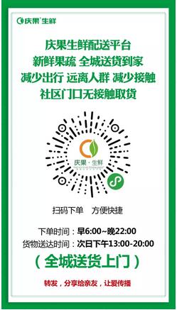 (一)下单平台:微信公众号搜索“庆果生鲜连锁”、微信小程序搜索“庆果”。