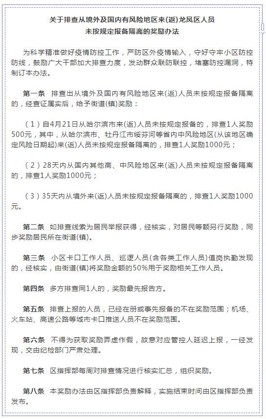 1人奖励1000元!大庆市龙凤区发布排查未按规定报备隔离人员奖励办法