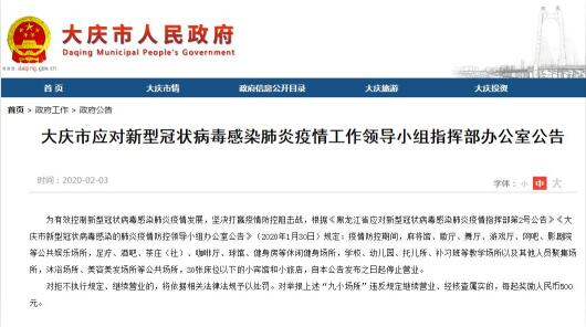 为有效控制新型冠状病毒感染肺炎疫情发展,坚决打赢疫情防控阻击战,根据《黑龙江省应对新型冠状病毒感染肺炎疫情指挥部第2号公告》《大庆市新型冠状病毒感染的肺炎疫情防控领导小组办公室公告》(2020年1月30日)规定:疫情防控期间,麻将馆、歌厅、舞厅、游戏厅、网吧、影剧院等公共娱乐场所,足疗、酒吧、茶庄(社)、咖啡厅、球馆、健身房等休闲健身场所,学校、幼儿园、托儿所、补习班等教学场所以及其他人员聚集场所,沐浴场所、美容美发场所等公共场所,30张床位以下的小宾馆和小旅店,自本公告发布之日起停止营业。