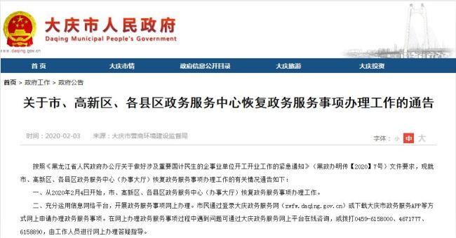 按照《黑龙江省人民政府办公厅关于做好涉及重要国计民生的企事业单位开工开业工作的紧急通知》(黑政办明传【2020】7号)文件要求,现就市、高新区、各县区政务服务中心(办事大厅)恢复政务服务事项办理工作的有关情况通告如下: