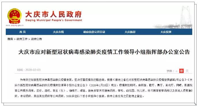 大庆市应对新型冠状病毒感染肺炎疫情工作领导小组指挥部办公室公告