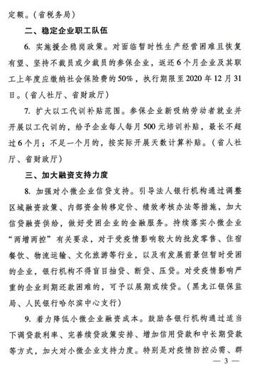 《意见》指出,为深入贯彻落实习近平总书记关于坚决打赢疫情防控阻击战的重要指示精神,全面落实党中央、国务院和省委、省政府关于疫情防控的各项决策部署,支持受到新型冠状病毒感染的肺炎疫情影响、生产经营遇到困难的中小微企业健康发展,在企业财税政策支持、稳定企业职工队伍、加大融资支持力度、帮助企业稳定生产、减轻企业生产经营负担等方面给予相应的政策支持。