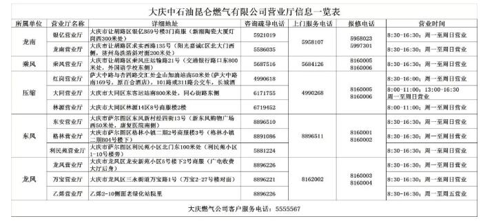 查询各分公司上门服务电话,可微信关注“大庆燃气”公众号。