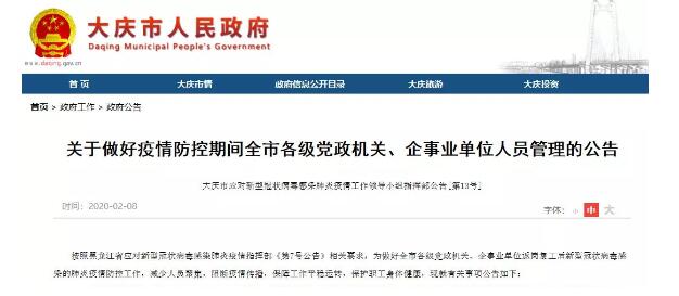 按照黑龙江省应对新型冠状病毒感染肺炎疫情指挥部《第7号公告》相关要求,为做好全市各级党政机关、企事业单位返岗复工后新型冠状病毒感染的肺炎疫情防控工作,减少人员聚集,阻断疫情传播,保障工作平稳运转,保护职工身体健康,现就有关事项公告如下:
