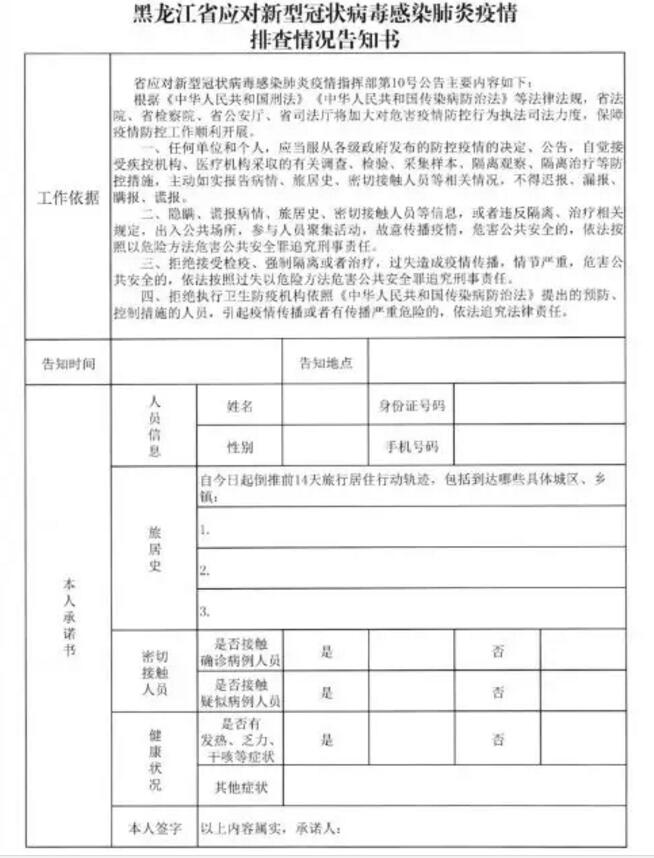 8日,省应对新型冠状病毒感染肺炎疫情工作领导小组指挥部办公室下发《关于统一使用<黑龙江省应对新型冠状病毒感染肺炎疫情排查情况告知书>的通知》,要求全省在开展流行病学调查时统一使用该告知书。