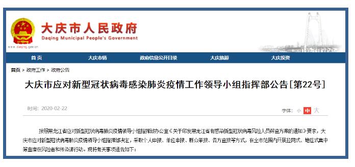 大庆市应对新型冠状病毒感染肺炎疫情工作领导小组指挥部公告[第22号]
