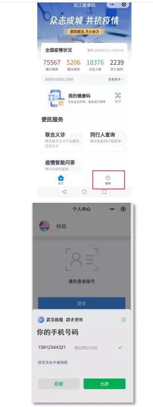 第二步:打开“龙江健康码”小程序,进入“我的”,点击“登录”,此处需绑定您的手机号码,点击“允许”完成登录操作。