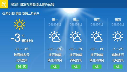 黑龙江省气象台2020年3月01日11时00分继续发布道路结冰黄色预警信号:受前期及未来降雪影响,未来24小时,齐齐哈尔、大庆、绥化、哈尔滨、佳木斯西部、双鸭山、七台河、鸡西、牡丹江将出现对交通有影响的道路结冰,请注意预防。
