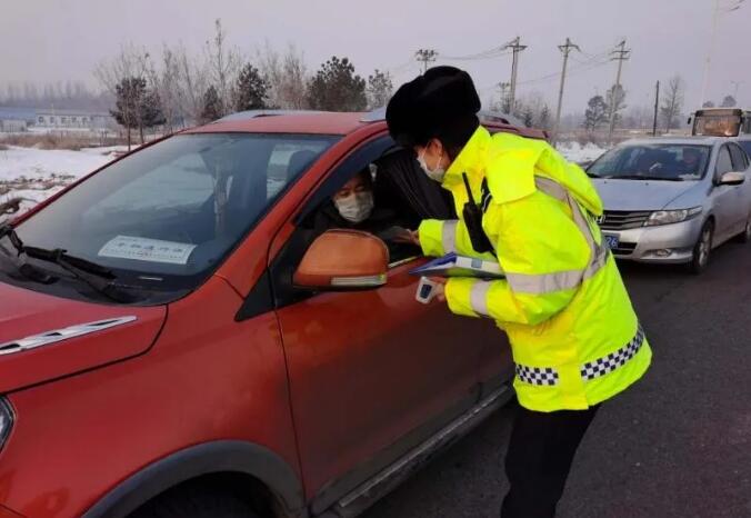 交警在路上向驾驶员宣传春季出行的注意事项