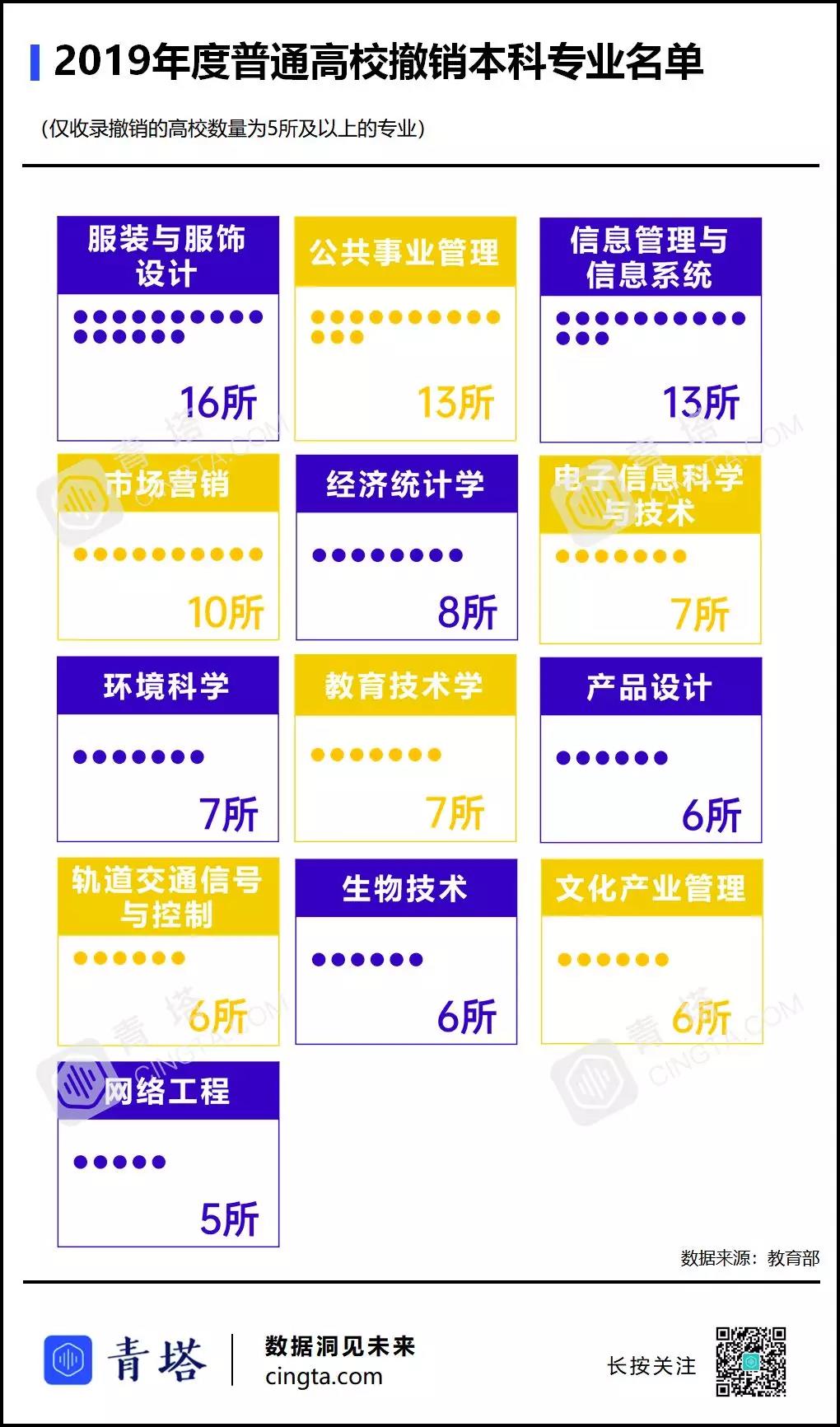 各高校撤销的专业中,服装与服饰设计、公共事业管理、信息管理与信息系统、市场营销、经济统计学等专业排位靠前。