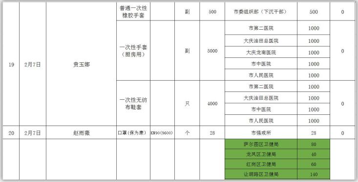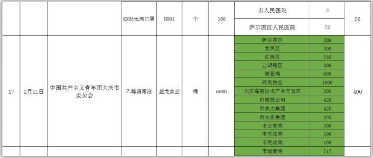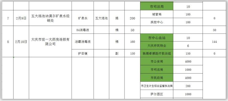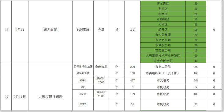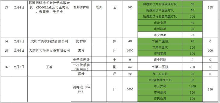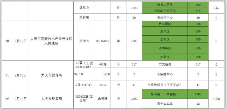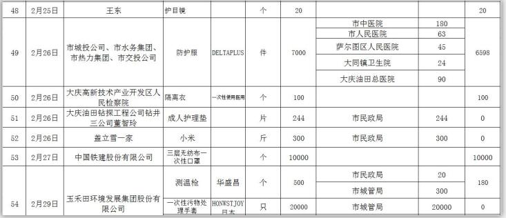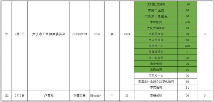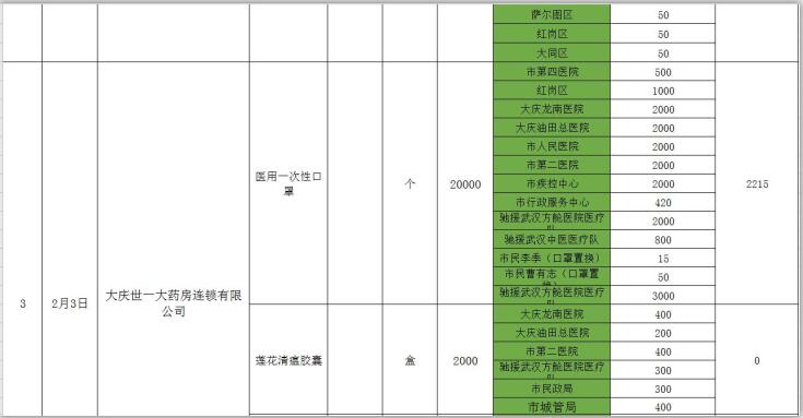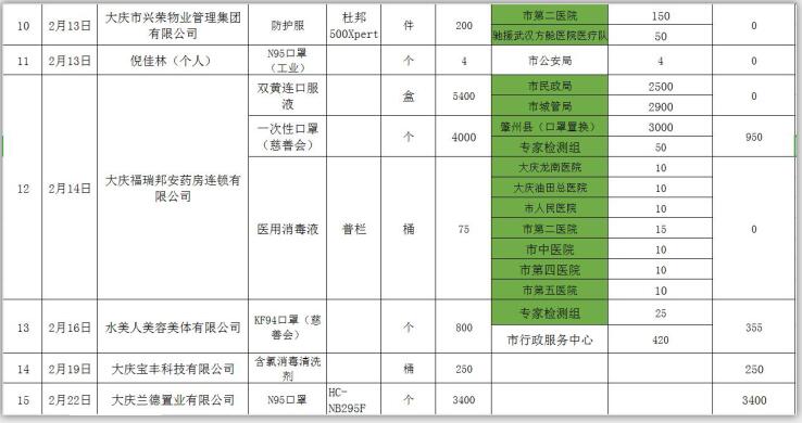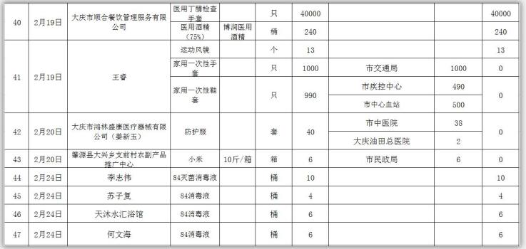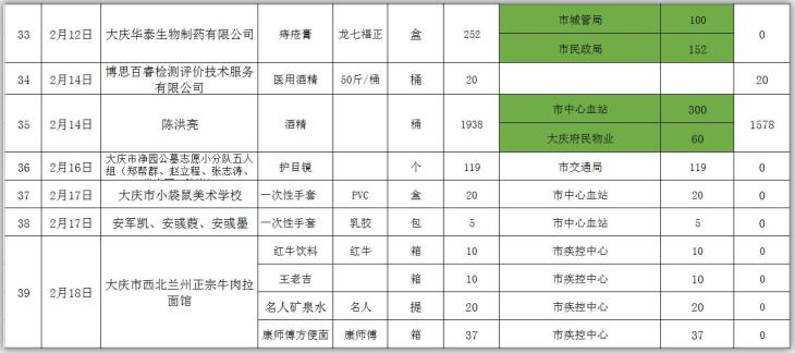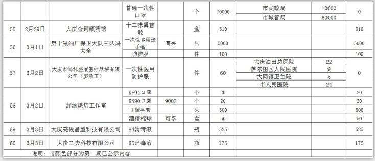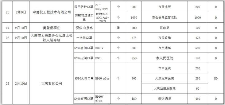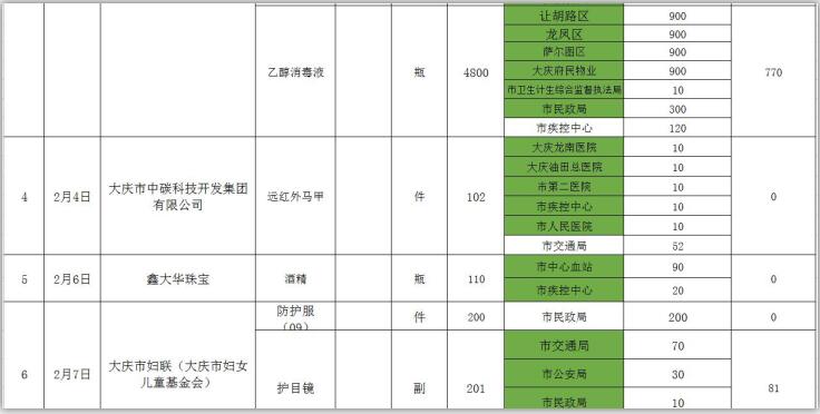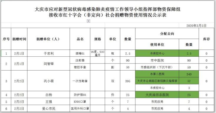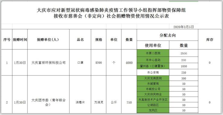新型冠状病毒感染的肺炎疫情发生以来,社会各界和爱心人士积极捐款捐物,支援全市开展疫情防控阻击战,形成了同舟共济、共同抗“疫”的浓厚氛围。为了全面接受社会监督,现将大庆市红十字会、大庆市慈善会移交市应对新型冠状病毒感染肺炎疫情工作领导小组指挥部统一调配使用的非定向捐赠物资截止到2020年3月3日分配使用情况公示如下: