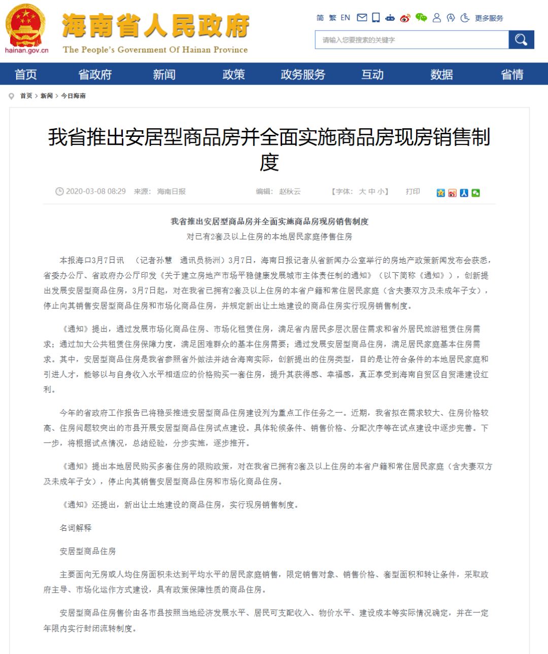 《通知》指出,海南省要改革商品住房预售制度,自文件印发之日起,新出让土地建设的商品住房,实行现房销售制度。