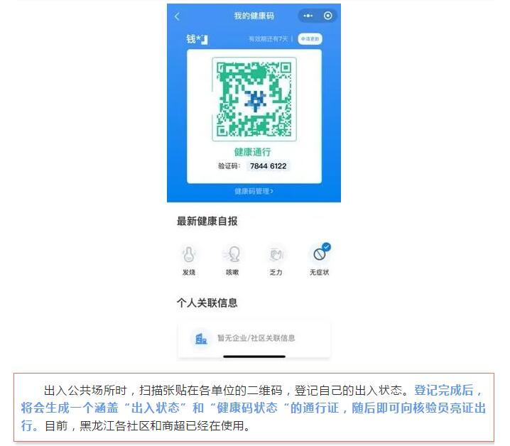 即日起,“龙江健康码”将在黑龙江省各个公共场所全面普及。黑龙江民众出入公共场所时都可以扫描各单位张贴在出入口的葵花码登记自己的出入情况,并向查验员展示自己的健康码状态,方便出行。