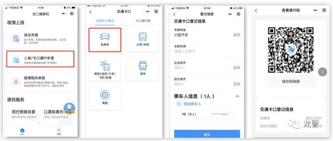 驾驶员/乘客进入“龙江健康码”小程序首页,选择“入省/卡口通行申请”后,进入私家车选项,填写车牌、出发地及目的地。确认信息无误后点击提交,便可完成本次出行登记,并生成通行码。