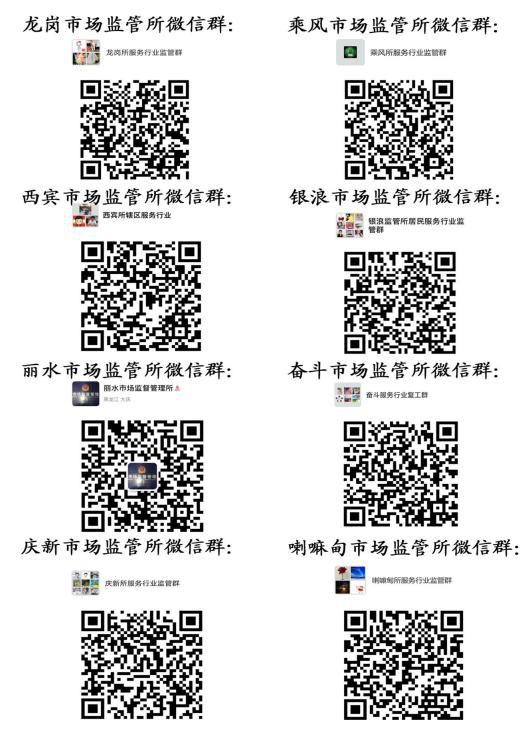 1、加入市场监管所微信群,自行下载《疫情防控承诺书》拍照发送至市场监管所监管微信群,同时在营业场所显著位置张贴《疫情防控承诺书》;也可携带经营者身份证原件、营业执照、公章到市场监督管理所签订《疫情防控承诺书》。 2、在市场监管所微信群内申请“龙江健康码”位置码,在营业场所进门处张贴,从业人员和消费者进入和离开时扫码管理; 3、在微信群内自行下载张贴限制人流公示单,每16平方米1人,鼓励实行预约服务和线上经营。 4、行业疫情防控规范和其他准备工作详见《疫情防控承诺书》。 龙岗市场监督管理所 6346002 西宾市场监督管理所 6341052 丽水市场监督管理所 5913650 庆新市场监督管理所 5836053 乘风市场监督管理所 5692728 奋斗市场监督管理所 6341060 银浪市场监督管理所 6341062 喇嘛甸市场监督管理所 6728065 |
