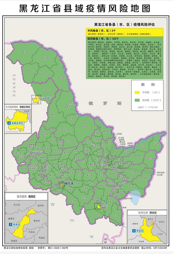调整后,我省有中风险县(市、区)3个,分别是南岗区、西安区、加格达奇区。其余122个县(市、区)均为低风险地区,要加快复工复产,恢复经济社会秩序。