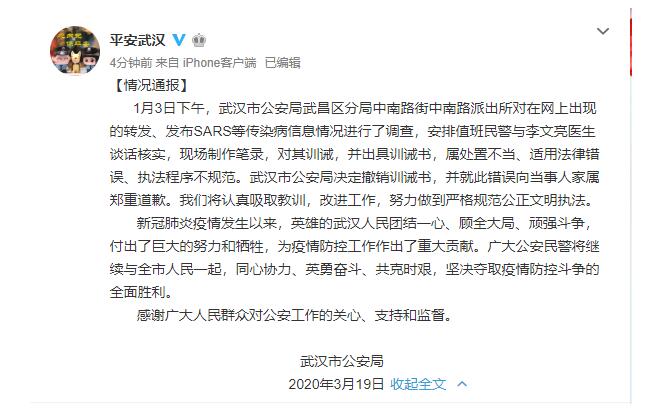 据武汉市公安局官方微博消息,1月3日下午,武汉市公安局武昌区分局中南路街中南路派出所对在网上出现的转发、发布SARS等传染病信息情况进行了调查,安排值班民警与李文亮医生谈话核实,现场制作笔录,对其训诫,并出具训诫书,属处置不当、适用法律错误、执法程序不规范。