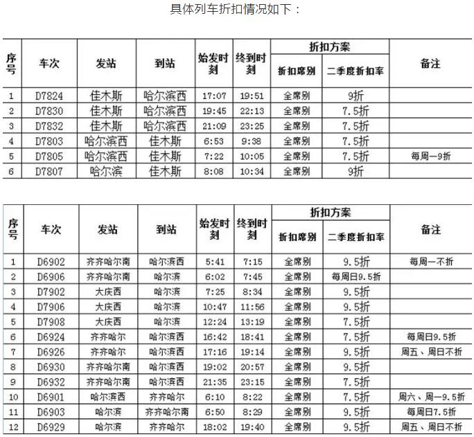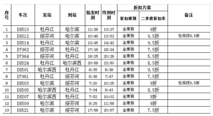 据了解,此次票价打折的动车组列车包括哈尔滨至齐齐哈尔、牡丹江、佳木斯、大庆、绥芬河等方向,涉及的31列动车组列车不分席别实行折扣优惠。除此之外,5.5折的票价优惠,是哈尔滨局集团公司有史有以来最大的折扣幅度。