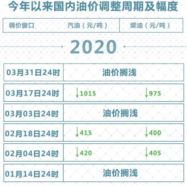 2020年,国内成品油调价已呈现“三跌三搁浅”的格局。截至3月31日,今年共有6次调价窗口期,其中2月4日、2月18日、3月17日国内成品油价格下调。截至本次调价,汽油价格累计每吨下调1850元,柴油价格累计每吨下调1780元。按照《石油价格管理办法》,本轮周期国内成品油价格挂靠的国际原油均价低于40美元/桶的“地板价”,国内油价今天将不调整。未调整部分将按照《油价调控风险准备金征收管理办法》规定,全额上缴中央国库,纳入一般公共预算管理。